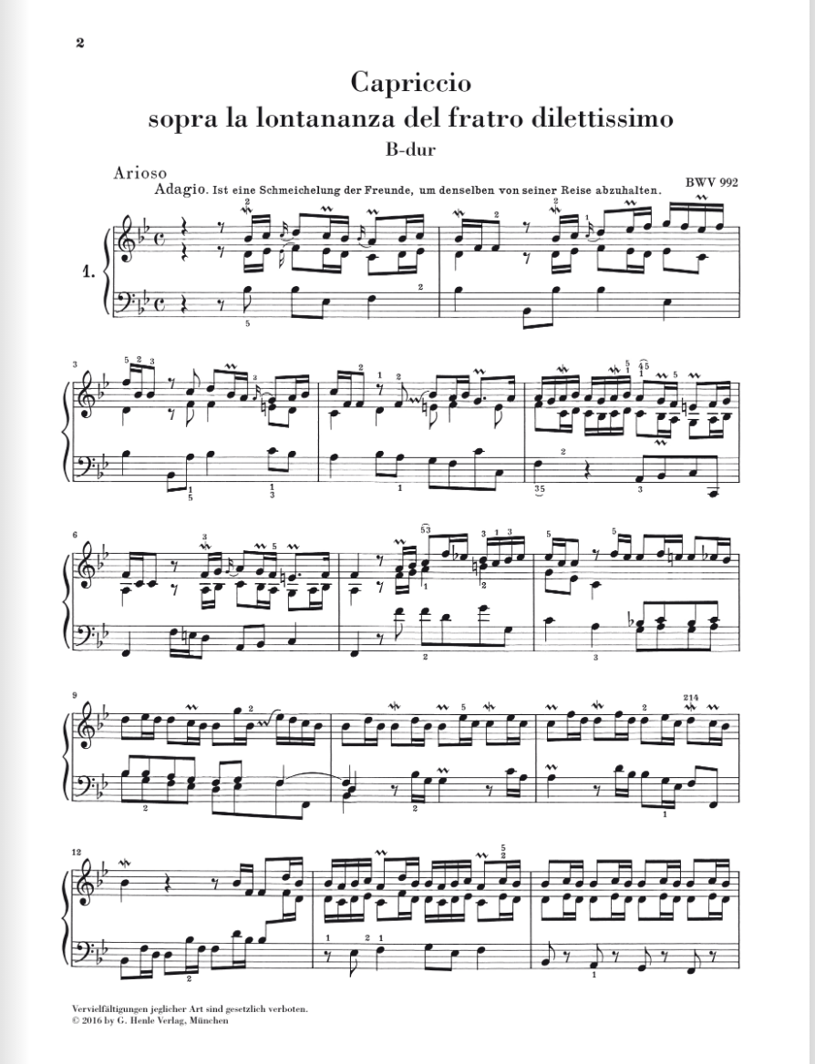 Bach Capriccio sopra la lontananza del fratro dilettissimo B flat major BWV 992