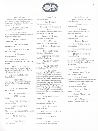 - Broadway Rag/Dixie Dimples/Don't Jazz Me, Rag (I'm Music)/Efficiency Rag/Evergreen Rag/The Fascinator/ Frog Legs Rag/Grace And Beauty/Great Scott Rag/Hilarity Rag/Kansas City Rag/Modesty Rag/New Era Rag/On The Pike/Ophelia Rag/Paramount Rag/Peace And Plenty/The Pegasus/Princess Rag/Rag Sentimental/Rag- time Betty/Ragtime Oriole/A Summer Breeze / Sunburst Rag/Troubadour Rag